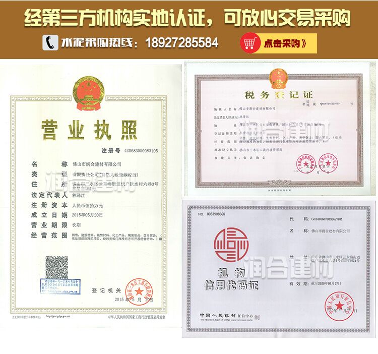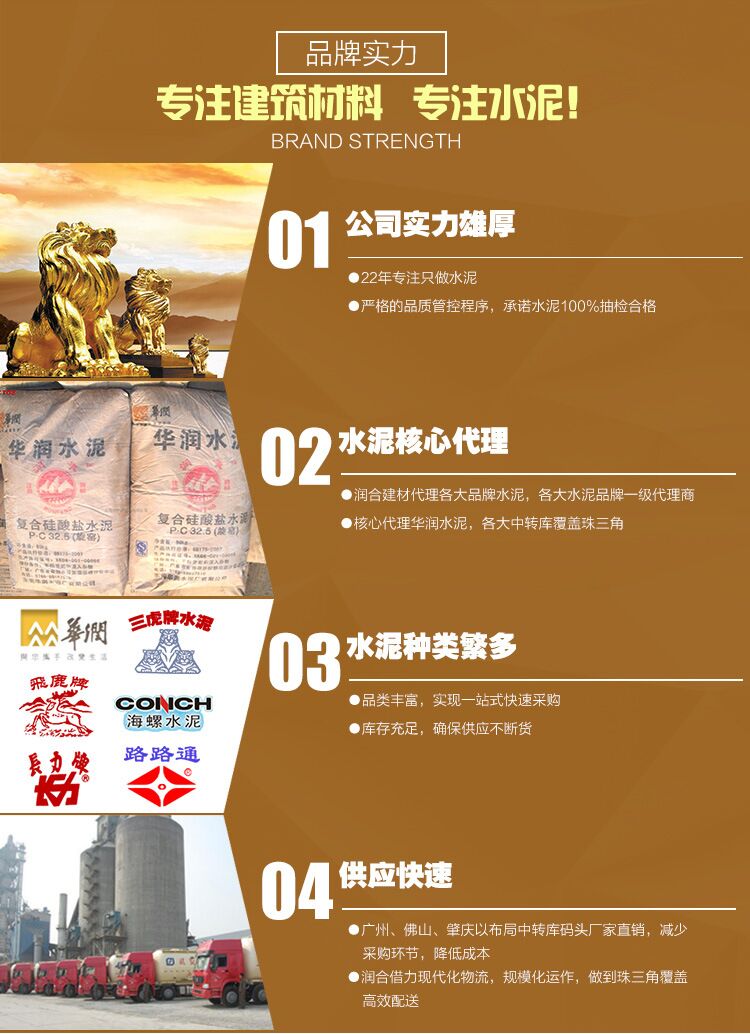 佛山市潤合建材公司 簡稱:廣東潤合。專注水泥22年生產/批發。主營:PC32.5R、PO42.5R、P1142.5R、PO52.5R華潤水泥、三虎水泥、海螺水泥、飛鹿水泥、路路通水泥、長力水泥。及C20、C25、C30、C35、C40、等C60以下混凝土。各大水泥品牌,在水泥采購商中享有較高的品質認可,廣東潤合與多家世界500強企業中鐵、中交、中國建筑和知名房企保利地產、碧桂園地產、龍光地產、美的地產長期合作。各品牌水泥有較大價格優勢,及水泥運輸配送優勢。佛山潤合水泥建材公司,將以薄利多銷及全心全意服務每位客戶。