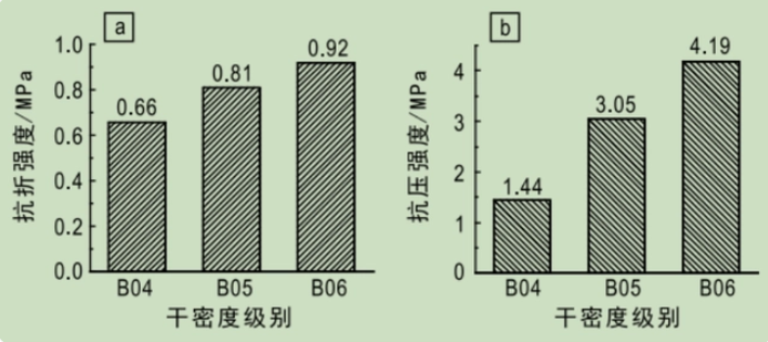 ▲ 不同干密度級別砂加氣混凝土抗折和抗壓強度